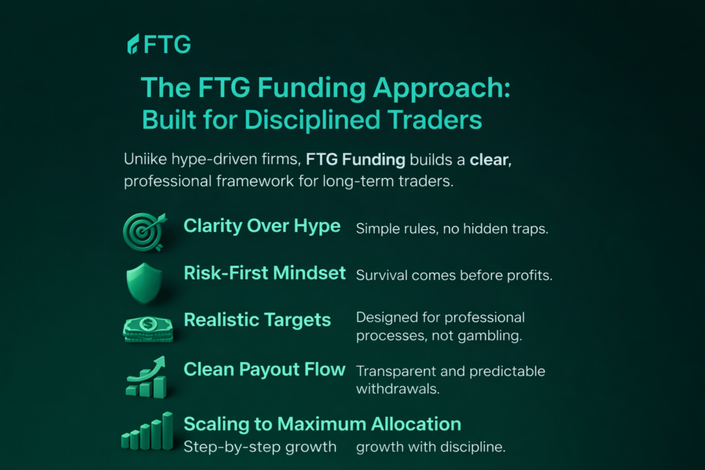 Unlike hype-driven firms, FTG Funding builds a clear, professional framework for long-term traders.