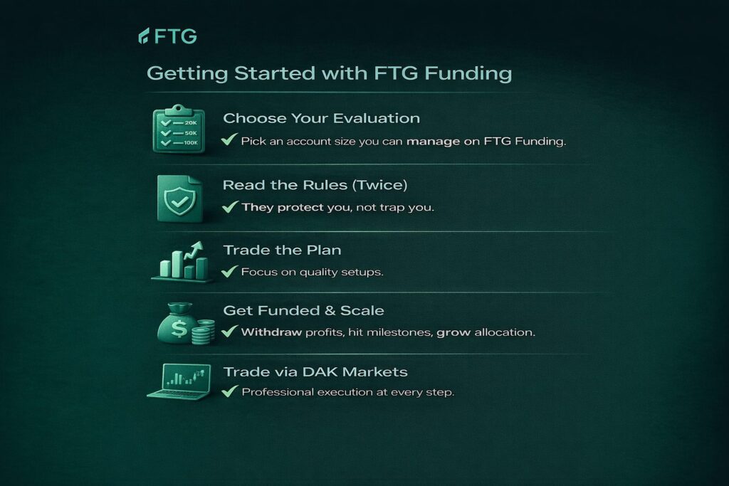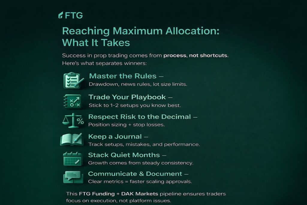 A serious prop firm isn’t a casino—it’s a professional environment designed for disciplined traders. With FTG Funding’s structured framework and DAK Markets’ execution infrastructure, you gain a path to scaling safely to maximum allocation without risking your own capital.