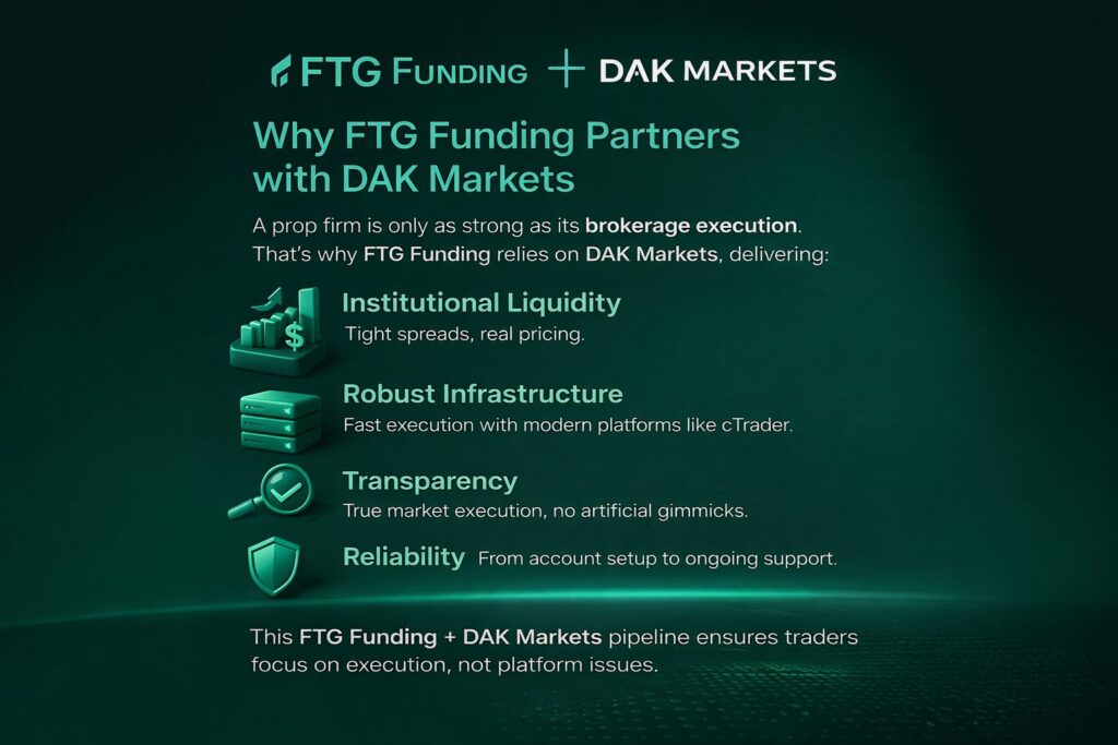 Through broker partnerships like FTG Funding x DAK Markets, traders gain access to institutional-grade pricing, liquidity, and platforms.