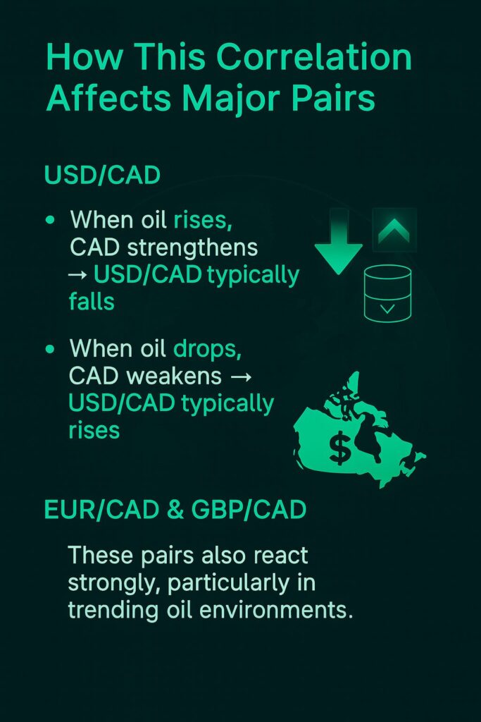 Traders who understand the Oil–CAD relationship can anticipate potential moves in several key pairs: