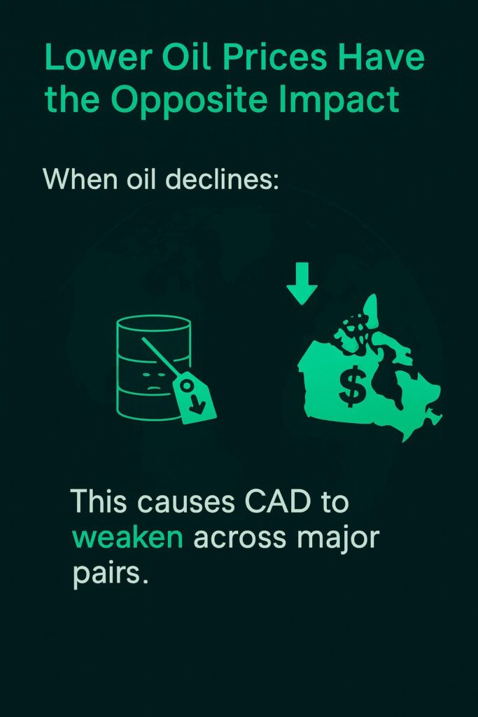 • When oil drops, CAD weakens → USD/CAD typically rises