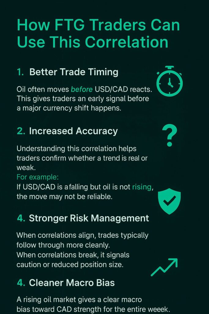 Becoming a successful funded trader means understanding the deeper mechanics of the markets — not gambling on random price movements. The Oil–CAD correlation is one of the cleanest, most reliable relationships in Forex, and every FTG trader should master it.